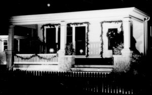 Lincoln Home NHS- Christmas in Lincoln Neighborhood House decorated for Christmas, location unknown. Miller? neighborhood, night, Christmas, decor, wreath, garland