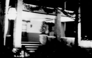 Lincoln Home NHS- Christmas in Lincoln Neighborhood Looking north west, Christmas decor on Rosenwald house exterior. neighborhood, night, Christmas, Lyon, Rosenwald, porch, garland