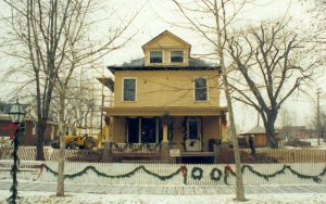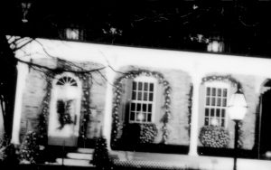 Lincoln Home NHS- Christmas in Lincoln Neighborhood Looking south west, Christmas decor on Rosenwald house at night. Christmas, decorations, neighborhood, night, decor, Rosenwald, Lyon, garland