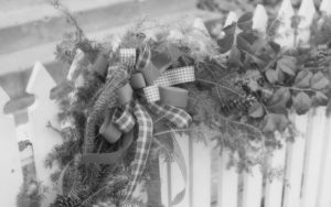 Lincoln Home NHS- Christmas in Lincoln Neighborhood Looking east, Christmas decor on gate of Corneau house, porch in background. Detail. Christmas, decorations, neighborhood, wreath, decor, fence, detail, Corneau