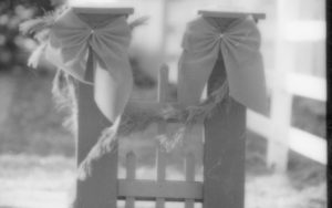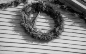 Lincoln Home NHS- Christmas in Lincoln Neighborhood Looking west, Christmas decor on Dean house fence. Detail. Christmas, neighborhood, Dean, fence, decor, bow, garland