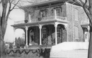 Lincoln Home NHS- Christmas in Lincoln Neighborhood Looking north east, Christmas decor on Conference Center house, retaining wall, porch, and house. Christmas, neighborhood, wall, decor, wreath, garland, porch, Conference, Center