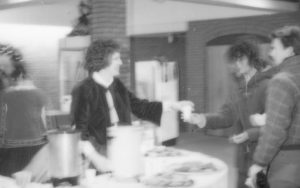 Lincoln Home NHS- Christmas in Lincoln Neighborhood Looking north west, staff in Visitor Center serving refreshments to visitors at table in lobby. Christmas, neighborhood, staff, visitor, refreshment, lobby, Visitor, Center