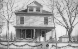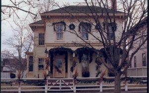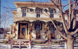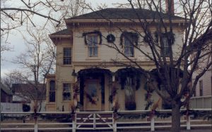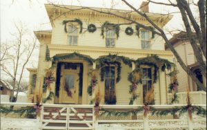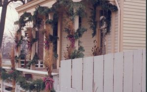 Lincoln Home NHS- Christmas in Lincoln Neighborhood Looking south west from boardwalk, Christmas decor on Rosenwald house. Christmas, neighborhood, decor, wreath, garland, Rosenwald, Lyon