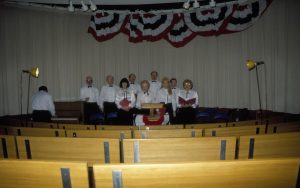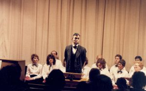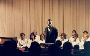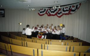Choir standing in front of curtain in theater one. Lincoln Home NHS- Lincoln's Birthday 1988 birthday, Lincoln, Douglas, musical Choir standing in front of curtain in theater one. Lincoln Home NHS- Lincoln's Birthday 1988 birthday, Lincoln, Douglas, musical