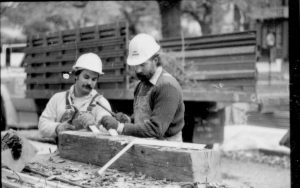 NA Restoration workers are hewing a replacement oak beam to replace a sill beam from the Lincoln Home. Restoration, Workers NA Restoration workers are hewing a replacement oak beam to replace a sill beam from the Lincoln Home. Restoration, Workers