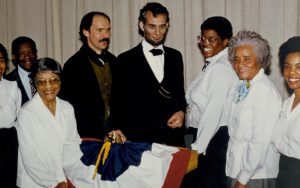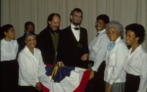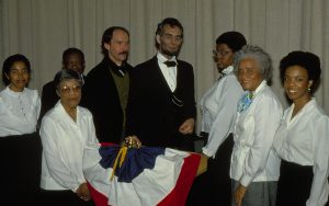 Lincoln impersonator and ladies standing in front of curtain. Lincoln Home NHS- Lincoln's Birthday birthday, Lincoln, play Lincoln impersonator and ladies standing in front of curtain. Lincoln Home NHS- Lincoln's Birthday birthday, Lincoln, play