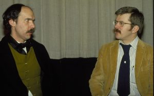 Two man (one in period dress) talking in front of curtain. Lincoln Home NHS- Lincoln's Birthday birthday, Lincoln, play Two man (one in period dress) talking in front of curtain. Lincoln Home NHS- Lincoln's Birthday birthday, Lincoln, play