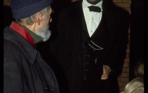 Lincoln impersonator and older man talking. Lincoln Home NHS- Lincoln's Birthday birthday, Lincoln, play Lincoln impersonator and older man talking. Lincoln Home NHS- Lincoln's Birthday birthday, Lincoln, play