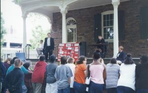 Iles School Living History program - Students perform mock trial on porch of Conference Center while school group watches from boardwalk. City parking garage in background left. Looking Northeast from 8th Street Iles School, living history, mock trial, Conference Center, parking garage, students, school groups