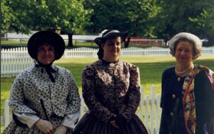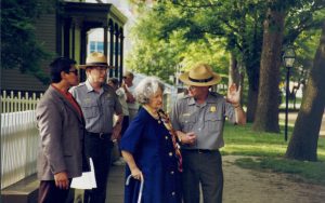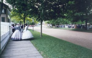 Iles School Living History program - Program Coordinators Paula Shotwell and Margie Atkins in period clothing chat on boardwalk. School groups throughout the park watching performances. Lincoln Home in background left. Corneau and Miller houses just visible in far background center. Looking south from boardwalk on East side of 8th Street Iles School, living history, school groups, Lincoln Home, Corneau, Miller, 8th Street
