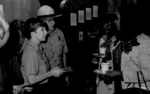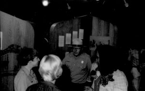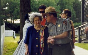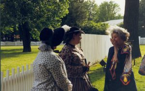 Iles School Living History program - Program Coordinators Paula Shotwell and Margie Atkins in period clothing chat on boardwalk. School groups throughout the park watching performances. Lincoln Home in background left. Corneau and Miller houses just visible in far background center. Looking south from boardwalk on East side of 8th Street Iles School, living history,…