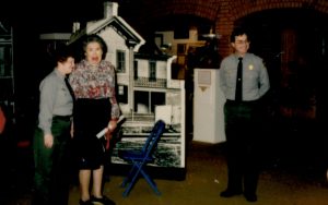 Ranger and lady seated in front of enlarged picture of home. Lincoln Home NHS- Author Ruth Ketchum visit, 11 Ketchum, visit Ranger and lady seated in front of enlarged picture of home. Lincoln Home NHS- Author Ruth Ketchum visit, 11 Ketchum, visit