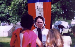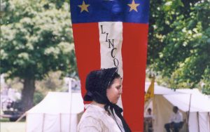 Lady in period dress standing in front of banner. Lincoln Home NHS- Grierson Days Jacksonville Grierson, Jacksonville, celebration Lady in period dress standing in front of banner. Lincoln Home NHS- Grierson Days Jacksonville Grierson, Jacksonville, celebration