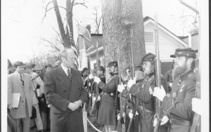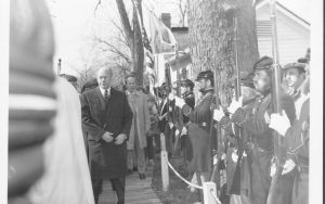 President Ford reviewing the 144th Regiment Lincoln Home NHS- President Ford and V.C. Corner Stone, neg #29 class 1000, class 8 pic 29, 139 President, Ford, visit