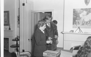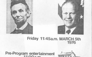 Judy Winkelmann in office before President Ford visit Lincoln Home NHS- President Ford and V.C. Corner Stone, neg #31 class 1000, class 8 pic 31, 141 President, Ford, visit