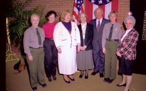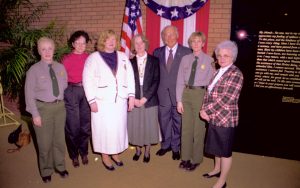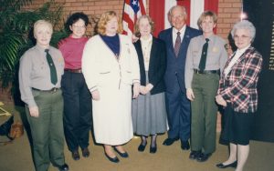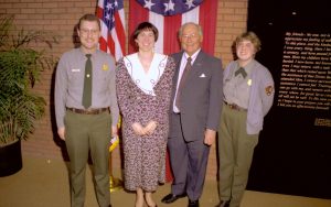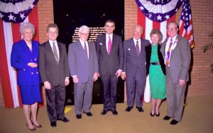 Group posing in front of American flag & bunting. Lincoln Home NHS- VIP Findley and Michel Visit to Lincoln Home visit, program Group posing in front of American flag & bunting. Lincoln Home NHS- VIP Findley and Michel Visit to Lincoln Home visit, program
