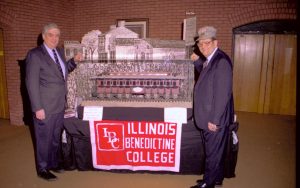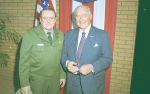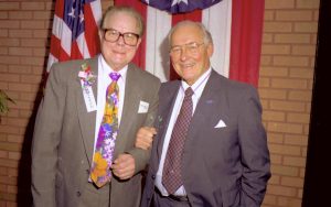 Two men standing in front of flag and bunting. Lincoln Home NHS- VIP Findley and Michel Visit to Lincoln Home visit, program Two men standing in front of flag and bunting. Lincoln Home NHS- VIP Findley and Michel Visit to Lincoln Home visit, program