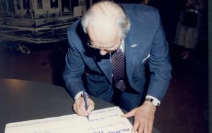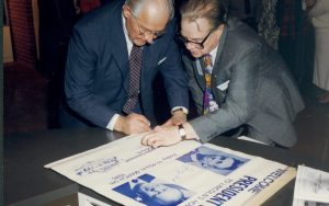 Man signing poster. Lincoln Home NHS- VIP Findley and Michel Visit visit, program Man signing poster. Lincoln Home NHS- VIP Findley and Michel Visit visit, program