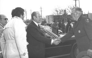 Two men shaking hands by auto. Lincoln Home NHS- President Ford and Visitor Center Corner Stone President, Ford, visit Two men shaking hands by auto. Lincoln Home NHS- President Ford and Visitor Center Corner Stone President, Ford, visit
