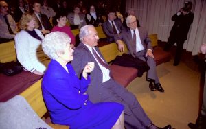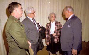 Four people standing in front of theater curtain, talking. Lincoln Home NHS- VIP Findley and Michel Visit to Lincoln Home visit, program Four people standing in front of theater curtain, talking. Lincoln Home NHS- VIP Findley and Michel Visit to Lincoln Home visit, program