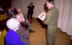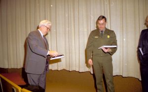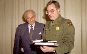 Man and ranger holding books. Lincoln Home NHS- VIP Findley and Michel Visit to Lincoln Home visit, program Man and ranger holding books. Lincoln Home NHS- VIP Findley and Michel Visit to Lincoln Home visit, program