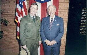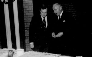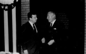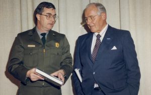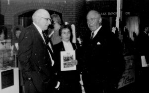 Two men conversing behind table. Lincoln Home NHS- Paul Findley and Michel VIP visit, 119 Finley, Michel, visit, reception Two men conversing behind table. Lincoln Home NHS- Paul Findley and Michel VIP visit, 119 Finley, Michel, visit, reception