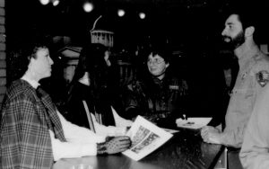 Three ladies at information desk. Lincoln Home NHS- Paul Findley and Michel VIP visit, 119 Finley, Michel, visit, reception Three ladies at information desk. Lincoln Home NHS- Paul Findley and Michel VIP visit, 119 Finley, Michel, visit, reception