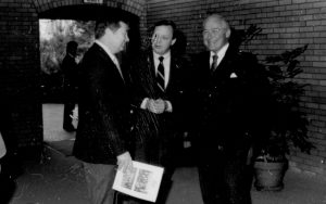 Three people standing, woman holding booklet. Lincoln Home NHS- Paul Findley and Michel VIP visit, 119 Finley, Michel, visit, reception Three people standing, woman holding booklet. Lincoln Home NHS- Paul Findley and Michel VIP visit, 119 Finley, Michel, visit, reception