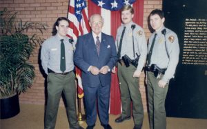 Three law enforcement rangers standing with man in front of flag & bunting. Lincoln Home NHS- VIP Findley and Michel Visit visit, program Three law enforcement rangers standing with man in front of flag & bunting. Lincoln Home NHS- VIP Findley and Michel Visit visit, program