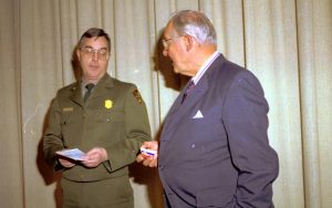 Ranger and man standing in front of bunting. Lincoln Home NHS- VIP Findley and Michel Visit visit, program Ranger and man standing in front of bunting. Lincoln Home NHS- VIP Findley and Michel Visit visit, program