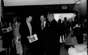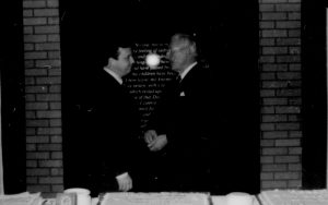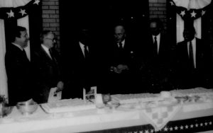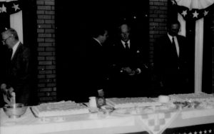 Men standing behind table. Lincoln Home NHS- Paul Findley and Michel VIP visit, 119 Finley, Michel, visit, reception Men standing behind table. Lincoln Home NHS- Paul Findley and Michel VIP visit, 119 Finley, Michel, visit, reception