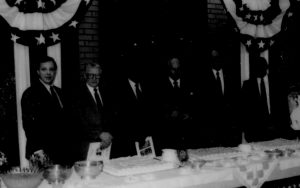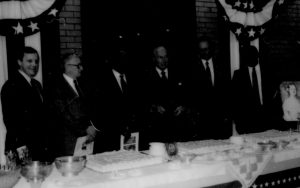 Six men lined up behind table. Lincoln Home NHS- Paul Findley and Michel VIP visit, 119 Finley, Michel, visit, reception Six men lined up behind table. Lincoln Home NHS- Paul Findley and Michel VIP visit, 119 Finley, Michel, visit, reception