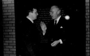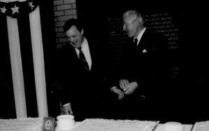 Two men conversing behind table. Lincoln Home NHS- Paul Findley and Michel VIP visit, 119 Finley, Michel, visit, reception Two men conversing behind table. Lincoln Home NHS- Paul Findley and Michel VIP visit, 119 Finley, Michel, visit, reception