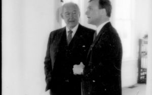 Two men conversing. Lincoln Home NHS- Paul Findley and Michel VIP visit, 119 Finley, Michel, visit, reception Two men conversing. Lincoln Home NHS- Paul Findley and Michel VIP visit, 119 Finley, Michel, visit, reception