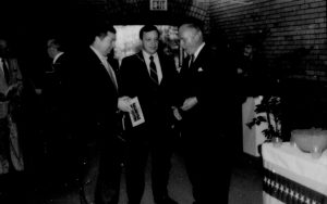 Three men conversing. Lincoln Home NHS- Paul Findley and Michel VIP visit, 119 Finley, Michel, visit, reception Three men conversing. Lincoln Home NHS- Paul Findley and Michel VIP visit, 119 Finley, Michel, visit, reception