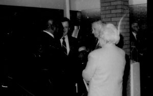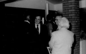Four people in conversation. Lincoln Home NHS- Paul Findley and Michel VIP visit, 119 Finley, Michel, visit, reception Four people in conversation. Lincoln Home NHS- Paul Findley and Michel VIP visit, 119 Finley, Michel, visit, reception