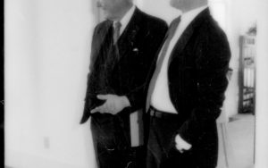 Two men standing in doorway. Lincoln Home NHS- Paul Findley and Michel VIP visit, 115 Finley, Michel, tour, visit Two men standing in doorway. Lincoln Home NHS- Paul Findley and Michel VIP visit, 115 Finley, Michel, tour, visit