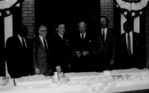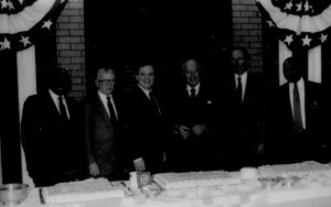 Six men lined up behind table. Lincoln Home NHS- Paul Findley and Michel VIP visit, 119 Finley, Michel, visit, reception Six men lined up behind table. Lincoln Home NHS- Paul Findley and Michel VIP visit, 119 Finley, Michel, visit, reception