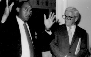 Two man in hallway (with others). Lincoln Home NHS- Paul Findley and Michel VIP visit, 117 Finley, Michel, visit, tour Two man in hallway (with others). Lincoln Home NHS- Paul Findley and Michel VIP visit, 117 Finley, Michel, visit, tour
