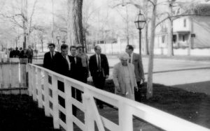 Men and woman walking down board walk. Lincoln Home NHS- Paul Findley and Michel VIP visit, 115 Finley, Michel, tour, visit Men and woman walking down board walk. Lincoln Home NHS- Paul Findley and Michel VIP visit, 115 Finley, Michel, tour, visit
