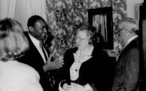 Two men and woman at enterance to Home. Lincoln Home NHS- Paul Findley and Michel VIP visit, 117 Finley, Michel, visit, tour Two men and woman at enterance to Home. Lincoln Home NHS- Paul Findley and Michel VIP visit, 117 Finley, Michel, visit, tour