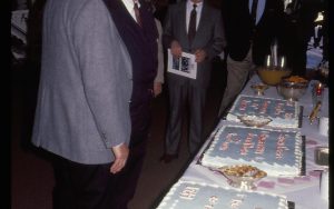 Men standing in front of tabke looking at cakes. Lincoln Home NHS- VIP Findley and Michel Visit award, visit, reception Men standing in front of tabke looking at cakes. Lincoln Home NHS- VIP Findley and Michel Visit award, visit, reception