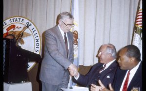 Two men shaking hands behind podium. Lincoln Home NHS- VIP Findley and Michel Visit award, visit, reception Two men shaking hands behind podium. Lincoln Home NHS- VIP Findley and Michel Visit award, visit, reception