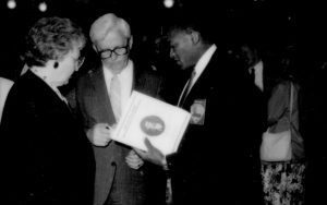 Ranger and visitor standing inVC. Lincoln Home NHS- VIP Findley and Michel Visit award, visit, reception Ranger and visitor standing inVC. Lincoln Home NHS- VIP Findley and Michel Visit award, visit, reception