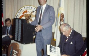 Man speaking, two men seated on either side. Lincoln Home NHS- VIP Findley and Michel Visit award, visit, ceremony Man speaking, two men seated on either side. Lincoln Home NHS- VIP Findley and Michel Visit award, visit, ceremony