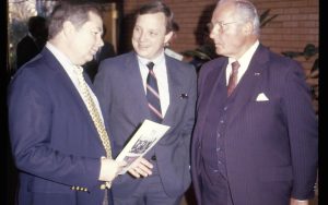 Three men standing, laughing in VC. Lincoln Home NHS- VIP Findley and Michel Visit award, visit, reception Three men standing, laughing in VC. Lincoln Home NHS- VIP Findley and Michel Visit award, visit, reception
