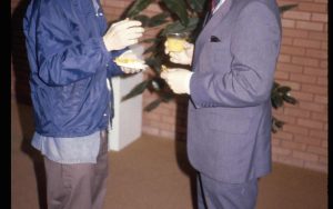Two men standing, eating, conversing in VC. Lincoln Home NHS- VIP Findley and Michel Visit award, visit, reception Two men standing, eating, conversing in VC. Lincoln Home NHS- VIP Findley and Michel Visit award, visit, reception