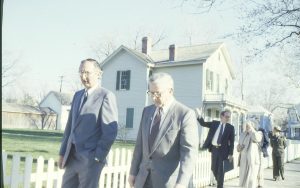 Men walking down board walk by Robinson house. Lincoln Home NHS- VIP Findley and Michel Visit award, visit, tour Men walking down board walk by Robinson house. Lincoln Home NHS- VIP Findley and Michel Visit award, visit, tour