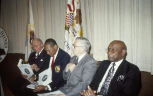 Four men seated in front of curtain and flags. Lincoln Home NHS- VIP Findley and Michel Visit award, visit, ceremony Four men seated in front of curtain and flags. Lincoln Home NHS- VIP Findley and Michel Visit award, visit, ceremony